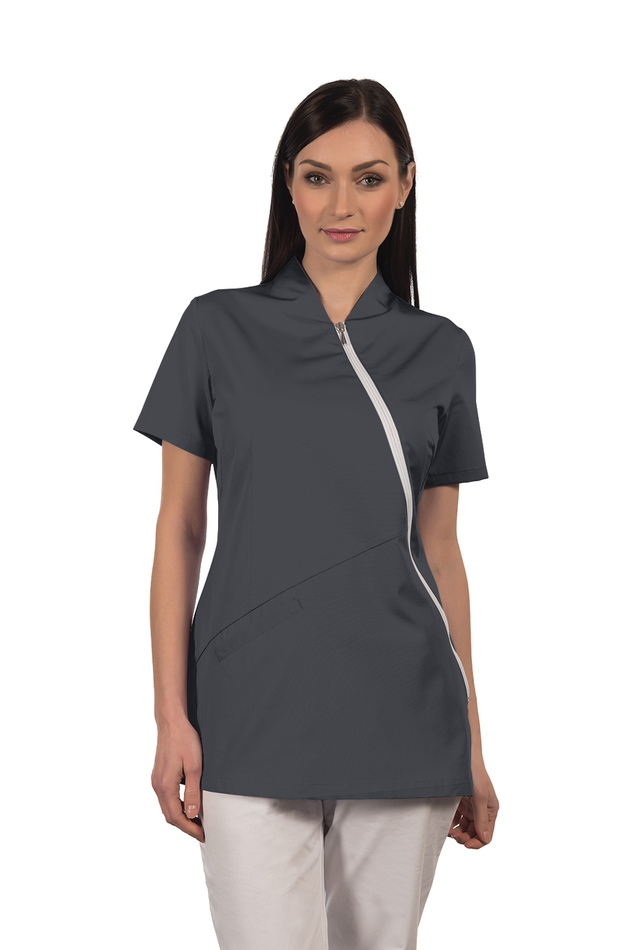 Casacca da donna 100% cotone con allacciatura diagonale e zip bianca, collo a V, tasca a filetto diagonale. Linea aderente.