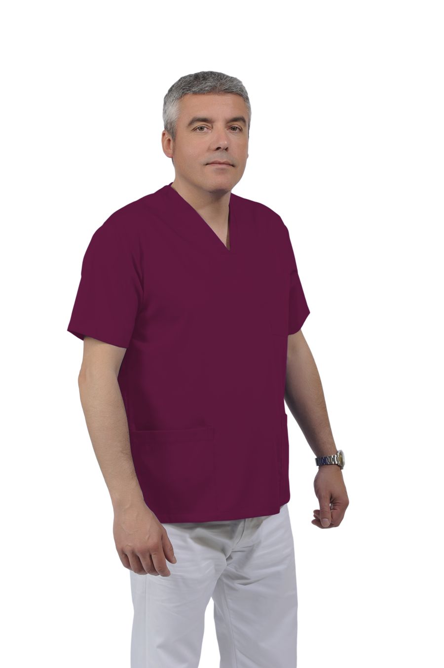 Casacca unisex 100% cotone, collo a V, un taschino e due tasche. Manica corta.