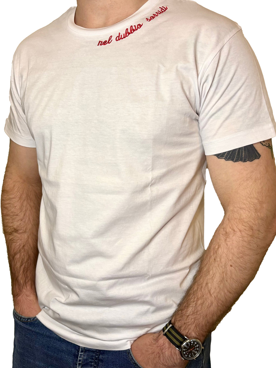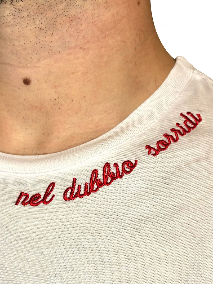 T-shirt in morbidissimo cotone organico al 100%, orgogliosamente realizzata in Italia, caratterizzata da un delicato design ricamato in rosso con la frase “nel dubbio sorridi”.